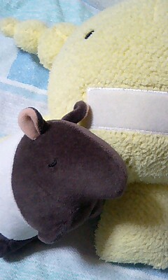 (左:ひとめぼれぬいぬい。ばくさん。オリゼーと一緒に同衾予定。悪い夢を食べるぞー! ってか悪い夢と縁がなさそな顔してらっさる。手触りふかふか耳がちょっと折れててカワユス!!)
