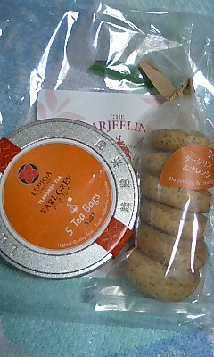 (右:そいや試飲会でお土産くれたです。アールグレイのティーバック5個入とダージリン&オレンジのクッキー)